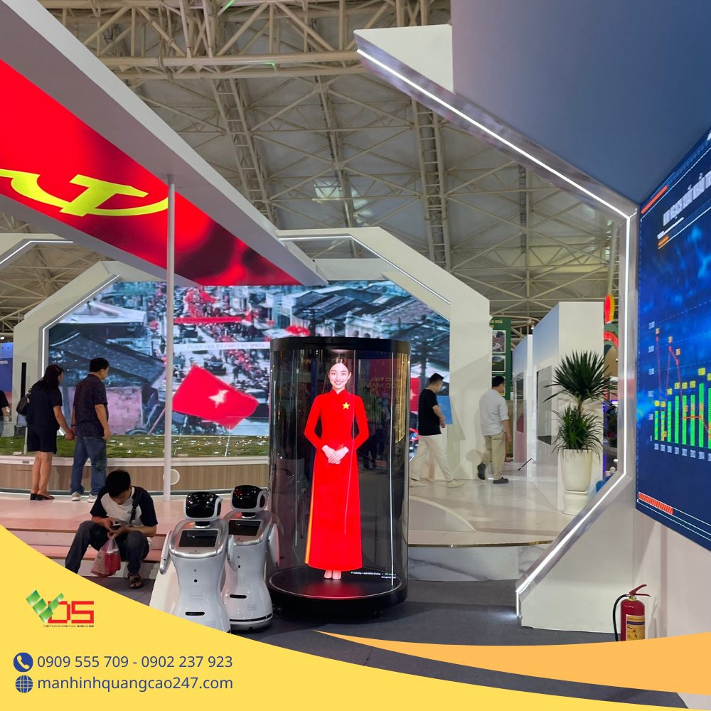 📦 Một điểm nhấn khác đến từ VDS là Holobox Hỏi – Đáp. Công nghệ này tái hiện nhân vật số 3D ngay trong hộp kính trong suốt, cho phép khách tham quan đối thoại trực tiếp.