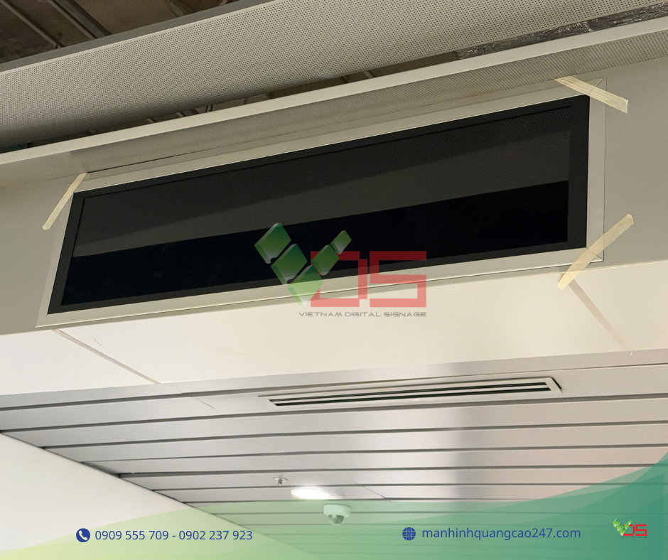 Màn hình dài, mỏng, có thể lắp âm trần, treo trên dải kỹ thuật hoặc khung kim loại sẵn có. Điều này giúp giữ nguyên trần kiến trúc, không cần cải tạo lớn mà vẫn tạo điểm nhấn hiển thị ấn tượng.