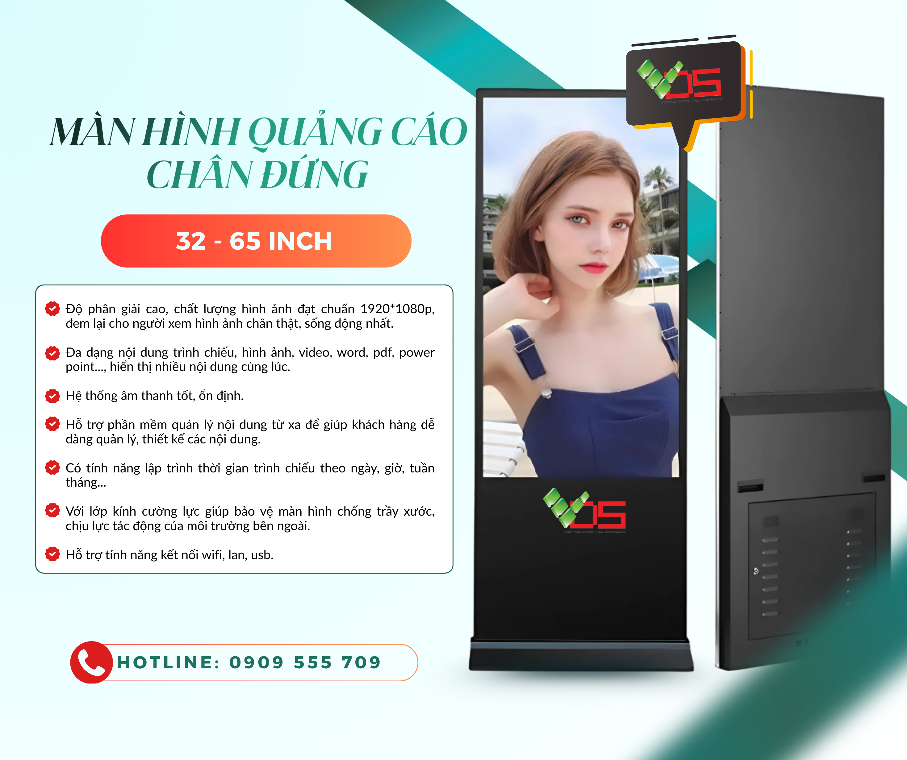 Trong bối cảnh khách hàng ngày càng bị “bội thực” bởi quảng cáo truyền thống, doanh nghiệp cần một phương thức hiển thị hiện đại, trực quan và dễ cập nhật để thu hút sự chú ý ngay tại điểm chạm. Màn hình quảng cáo chân đứng 32–65 inch của VDS chính là lựa chọn tối ưu cho các không gian từ nhỏ đến lớn, giúp tăng độ nhận diện thương hiệu, hỗ trợ bán hàng và tạo trải nghiệm chuyên nghiệp trong mắt khách hàng.